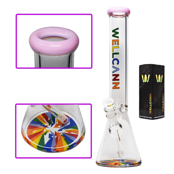 Traditional Glass Bong Height: 17″ Colour: Variety with Blue Base and Pink Mouth Piece